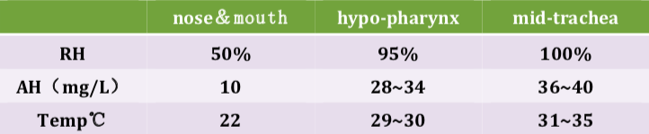 用鼻子呼吸時,吸到隆突上方的氣體已經(jīng)被加熱到接近 36°C ,加濕到含水量 80% 到90% 。氣道各個部位的溫度、濕度生理參考值見下圖